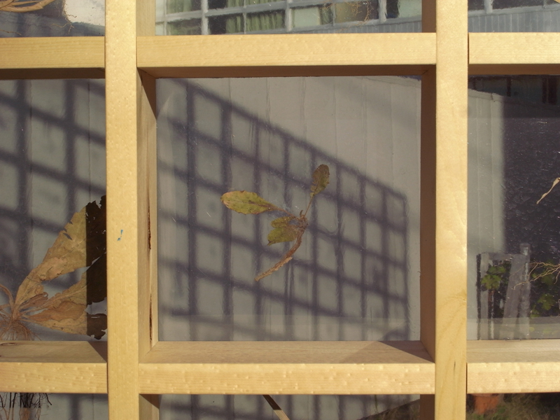 イメージとしては、地面のある区画の雑草を、そのまま壁として立上げる様に、その区画にある雑草を全て抜き、乾燥させて、壁面状の棚に設置した透明板に挟んだ。