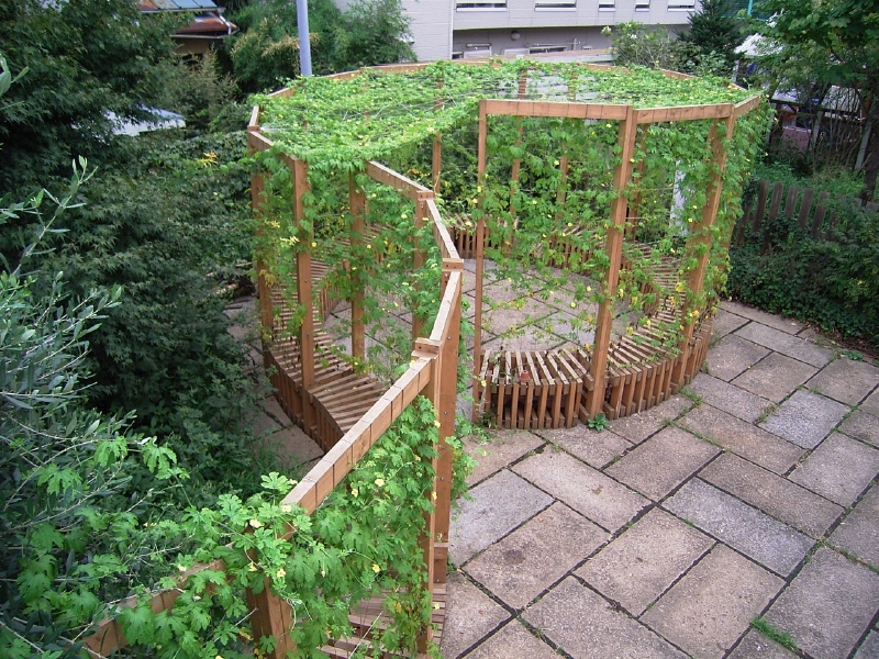 花屋の庭先に現れた、椅子の集合体。それらの座面の下からは、植物が生えて来ている。 何が出来るのか、何が生まれるのか、環境とは何か、建築とは何か。とりあえずそんな事を少しでも考えられればと、考えて作り、作りながら考えた。
